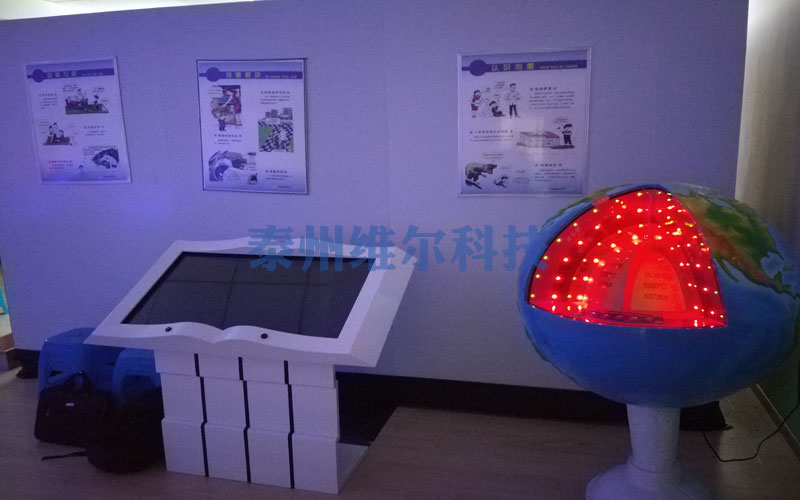 地球內(nèi)部構(gòu)造聲光電版 采用直徑1m地球儀北半球1/8對開,移動半球展示地殼、地核、軟流層、上地幔、下地幔,按下相關(guān)按鈕,發(fā)光顯示并伴有同步語音介紹。