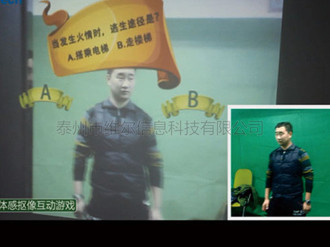 游戲待機(jī)畫面尾循環(huán)播放視頻。玩家站到綠幕指定區(qū)域則開始游戲。 關(guān)卡一:玩家需要在指定區(qū)域移動腳步,用身體接住屏幕上方落下的道具,在限定時間內(nèi)接滿全部道具則進(jìn)入下一關(guān),相反則游戲失敗,回到待機(jī)畫面; 關(guān)卡二:玩家需要在指定區(qū)域移動腳步,站在當(dāng)前問題的正確答案所在位置,答對所有答案則進(jìn)入下一關(guān),相反則游戲失敗,回到待機(jī)畫面; 關(guān)卡三:玩家需要再指定區(qū)域原地跑步,通過跳躍和下蹲躲過屏幕中迎面而來的障礙,在限定時間內(nèi)躲過所有障礙則進(jìn)入下一關(guān),碰撞到障礙則游戲失敗,回到待機(jī)畫面;可以收集屏幕中的滅火器道具,讓身體周圍出現(xiàn)屏障,屏障存在時間內(nèi)障礙物無法對玩家造成傷害; 關(guān)卡四:請參考關(guān)卡二說明; 關(guān)卡五:玩家需要移動身體和揮動雙手,把屏幕中的火焰撲滅,在限定時間內(nèi)讓一定比例的火焰熄滅則游戲通關(guān),相反則游戲失敗,回到待機(jī)畫面。